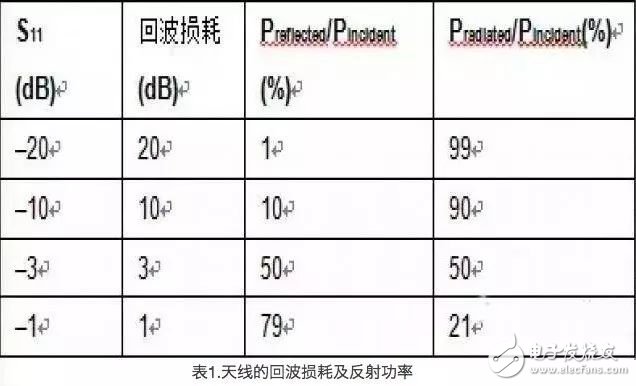 下面部分提供了天线性能的某些关键参数。§ 回波损耗:天线的回波损耗表示天线如何与阻抗为50Ω的传输线(TL)实现匹配,将其显示为图7中的信号馈送。通常,这个TL的阻抗值为50Ω,但也可以是其他数值。对于工业标准,商业天线和它的测试设备的电阻为50Ω,因此建议您最好使用该值。回波损耗指出:由于不匹配,天线反射的入射功率大小(公式1)。一个理想的天线会发射全部功率,不会产生任何反射。公式1 Return Loss(dB)= 10 log(Pincident/Preflect)如果该回波损耗是无限的,则认为天线与TL完全匹配,如图7所示。S11是回波损耗的倒数,其单位为dB。根据经验估计,如果回波损耗≥10dB(既S11≤–10dB),便足够大。表1显示了天线的回波损耗(dB)与反射功率(%)。回波损耗为10dB时,表示90%的入射功率被传给天线以进行发射。