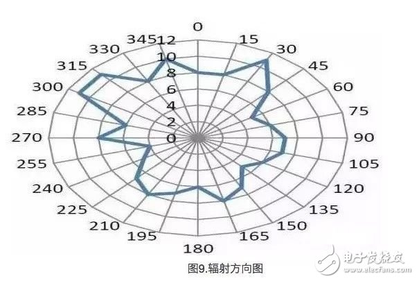 如图8所示,在2.33GHz至2.55GHz的带宽上,回波损耗大于10dB。因此,采用的带宽为200MHz左右。§ 辐射效率:指的是非反射功耗中的一部分(请参见图7)被消耗为天线中的热量。产生热量是由于FR4基板中的介电损耗以及铜线中的导体损耗造成的。该信息作为辐射效率。辐射效率为100%时,全部非反射的功耗都被发射到空间内。对于小型的PCB外形因素,热耗最小。§ 辐射图型:该图型表示辐射的方向性,即表示在哪个方向上的辐射更大,哪个方向上的辐射更小。这有助于在应用中准确地确定天线的方向。无方向性天线可以按与轴线相垂直的平面上所有方向进行等效发射。但大多数天线都达不到这个理想的性能。欲了解详细说明,请参看图9中所示的PCB天线的辐射图。每个数据点都代表RF场强,可以通过接收器中用于接收信号强度的指示器(RSSI)进行测量。正如所料的情况,获得的轮廓图像并不是圆形的,因为该天线不是各向同性的。