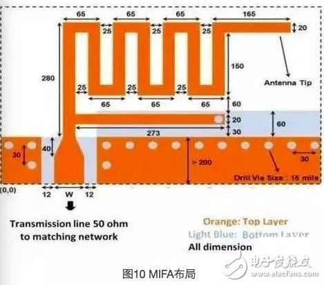 MIFA是一种普通的天线,被广泛地使用在各个人机接口设备(HID)中,因为它占用的PCB空间较小。因此赛普拉斯已设计出一种结实的MIFA天线,而它能在较小的波形系数中提供优越的性能。该天线的尺寸为7.2mm×11.1mm(相当于284密耳×437密耳),因此它很适合于各种HID的应用,例如无线鼠标、键盘或演示机等。图10显示的是所推荐的MIFA天线的详细布局,其中包含了双层PCB的顶层和底层。这种天线的迹线宽度均为20密耳。“W”的值是可改变的主要参数,它取决于PCB堆栈间隔,它表示RF走线(传输线)的宽度。