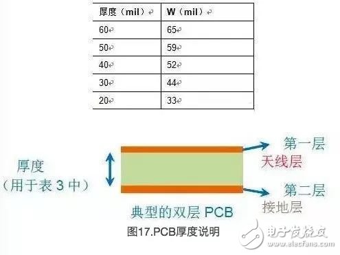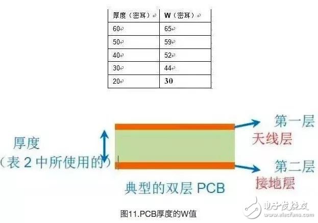 表2显示的是双层FR4PCB顶层和底层间厚度的“W”值(相应的介电常数为4.3)。顶层包含了天线走线;而底层则是包含了固态RF接地层的下一层。底层的余下PCB空间可以作为信号接地层使用(针对PRoC/PSoC和其他电路)。图11显示的是典型的双层PCB厚度的“W”值。表2.FR4PCB的“W”值:天线层与相邻射频的接地层间的厚度。