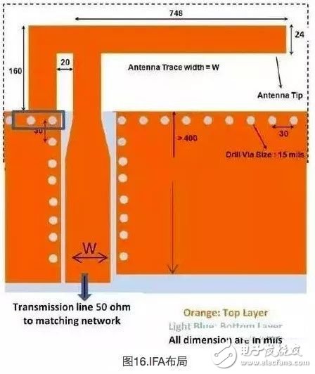 对于天线的尺寸有一定限制条件的应用中(例如心率监视器),推荐您选用这种IFA。图16显示所推荐的IFA的详细布局,其中包含了双层PCB中的顶层和底层。其走线宽度约为24mm。对于厚度为1.6mm的FR4PCB,IFA的尺寸被设计为4mm×20.5mm(157.5mils×807mils)。与MIFA相比,IFA的宽高比(宽度和高度的比例)更大。