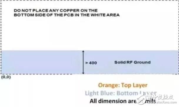 对于为天线馈电更短的PCB走线,这样的宽度要求是比较宽松的。要确保天线走线的宽度和天线馈电接点的宽度相同。在图12展示的情况中,天线馈电的走线宽度不是表2中所规定的宽度。