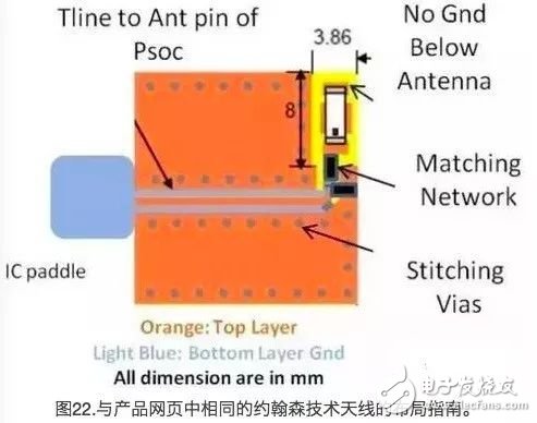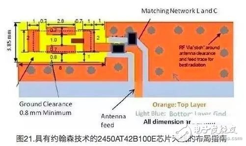 使用芯片天线时,也应考虑另一个关键因素:它受辐射接地面积的影响。所以,必须遵循厂家对接地面积的推荐。与PCB天线不同,芯片天线不能通过改变天线长度来调整。另外需要一个匹配网络才能调整该天线,因此会增加更多的材料清单。赛普拉斯只推荐将芯片天线使用在要求PCB空间极小的特定应用中,例如:Nano蓝牙收发器。对于这样的应用,赛普拉斯建议使用具有约翰森技术的2450AT18B100E芯片天线,其尺寸为63milx126mil。而对于大部分应用,则建议使用PCB天线,如MIFA或IFA。这些小外形(占用空间小)天线不但廉价,而且提供的性能非常卓越。图21和图22显示的是具有约翰森技术的2450AT42B100E芯片天线布局指南。其尺寸为118milx196mil。更多有关这些天线的详细指南,请参考它们相关的网址。