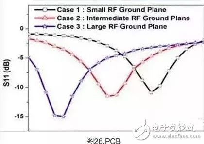 通常消费类产品中所使用的天线对PCB射频接地层的大小和产品的塑料外壳非常敏感。可将天线模拟为一个LC谐振器,当L(电感)或C(电容)增加时,该LC谐振器的谐振频率会下降。更大的射频接地层和塑料外壳会增大有效电容,从而降低谐振频率。接地层的影响赛普拉斯已经广泛地研究了射频接地层的大小和附近塑料外壳对天线谐振频率产生的影响。通过实验和测量证明,赛普拉斯可以确定天线的灵敏度并提供一个既简单强大,又有效的解决方法,以便调试天线。要想评估天线对射频接地层大小的灵敏度,可以通过在各种可能尺寸的PCB上安装天线进行实验。图26显示的是MIFA被放置在接地层大小不同的PCB上的示例。PCB的尺寸范围为20mm×20mm至50mm×50mm。通过该曲线可以了解到,射频接地层的面积越大,那么谐振频率越低,并且接地层也越好,因此回波损耗也会越小。这便是好的PCB布局中的关键条件。给四分之一波长的天线提供的接地层越好,它与理论性能的关系也会越好。这是进行天线设计中的关键概念,可以解决没有足够空间提供给接地小型模块天线的困难。