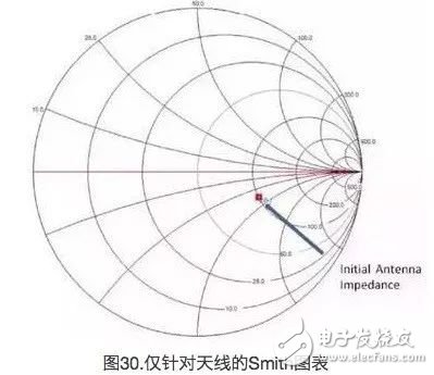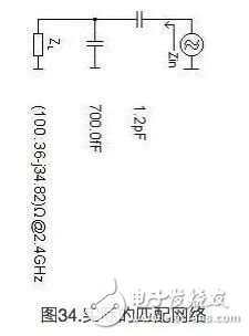 下面是该操作的简要说明。天线阻抗来自假定阻抗为0欧姆的8.2pF电容器。此外,该图也显示了频率为2.4Ghz时走线间电感的寄生电容。接地返回路径紧挨着该天线。但由于使用了匹配组件,接地返回路径将有额外的寄生电容。这样天线的电感会很大,所以要添加几个电容器以调整该电感。这是调整天线时遇到的典型问题。理论与实践间存在着明显的差别。用户可添加一个电容器,但请注意,如果添加某个电感,Smith图会向一定的方向移动。图35显示的是使用实际组件的最终Smith图表。