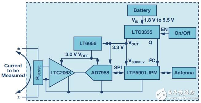 图1. 低功耗无线电流检测电路由一个低功耗斩波运算放大器(用以放大检测电压)组成,利用低功耗ADC和基准电压源进行数字化处理,连接到SmartMesh IP无线电模块。电池输出到低功耗DC-DC转换器得到恒定电源,同时记录从电池获取的电荷。