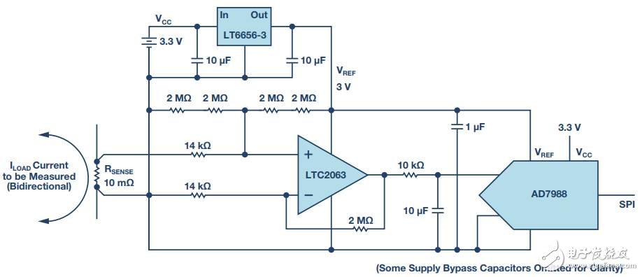 图2. 电流检测电路随同检测电阻电压浮空。斩波运算放大器LTC2063放大检测电压,把它偏置到AD7988 ADC的中间轨。LT6656-3提供精密3 V基准电压源。