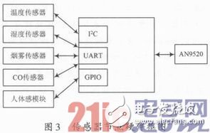 无线传感器网络节点包括一级节点、二级节点和传感器节点,这三类网络节点的硬件设计主体结构是相同的。无线传感器网络节点以德州仪器高性能低功耗的CC2530F256单片机为核心,CC2530F256集成了8051内核,256 KB系统可编程FLASH,8 KB RAM,具有丰富的外围设备,节点发射功率可达4.5 dB。在天线部分利用AN9520贴片天线,不仅保证了网络节点通讯的稳定性,而且大大减少了节点的体积,适合于家居室内网络的搭建。在无线传感器网络的传感器节点,通过CC2530的设备外设与传感器通信,传感器的类型可以根据用户的实际需求来灵活决定。在本实验中,系统选用了基于I2C总线的TCN75温度传感器,DHT11数字湿度传感器、MQ-7一氧化碳传感器、MQ-2烟雾传感器以及DYP-ME003红外人体感模块。其中当人进入DYP-ME003人体感模块感应范围时,DYP-ME003人体感模块会输出高电平告知用户检测环境中有人活动。传感器节点硬件框图如图3所示。