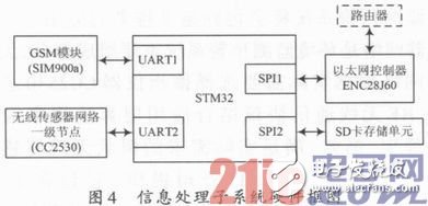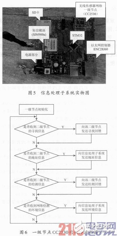 环境监测预警系统由无线传感器网络子系统和信息处理子系统2部分组成。系统框图如图2所示。无线传感器网络系统采用树型结构,分为一级节点、二级节点和传感器节点。其中一级节点是无线传感器网络的核心,无线传感器网络所检测到的环境信息最终都要通过一级节点传给信息处理子系统。二级节点主要起到数据中转的作用,保证了无线传感器网络中的传感器节点可以稳定地与一级节点通信。传感器节点根据用户需求安装相应的传感器(如温湿度传感器、红外传感器等)。信息处理子系统以意法半导体的STM32芯片为核心,在STM32单片机中植入uIP1.0协议建立显示家居环境信息的Web服务器,同时配有以太网控制器ENC28J60和GSM模块SIM900A,可以让用户方便地利用上网设备连接系统所在网络查看家居环境信息,在家居环境出现异常时也可以及时收到报警短信。
