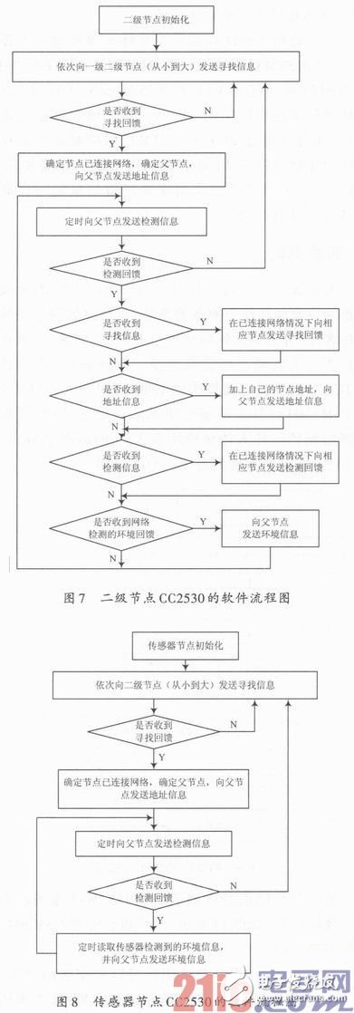 无线传感器网络子系统以CC2530的Basic RF无线通信协议为基础,结合应用层算法程序构建了树状网络结构,分为一级节点、二级节点和传感器节点。一级节点是无线传感器网络的核心,传感器节点检测到的环境数据最后都要通过无线传感器网络发送至一级节点。二级节点负责数据中转,实际应用中,在家居每个房间设置一个二级节点,保证所有环境信息可以最终传到一级节点。传感器节点选择相应的二级节点作为自己的父节点,把传感器检测到的环境信息发到父节点并最终传送至网络的一级节点。无线传感器网络在建立时,首先启动一级节点,二级节点启动时依次向各个一级节点二级节点发送寻找信息,如果收到寻找回馈,则确定自己的父节点并向父节点发送自己的地址信息。传感器节点启动时依次向各个二级节点发送寻找信息,如果收到寻找回馈,则确定自己的父节点并向父节点发送自己的地址信息。在网络建立后,二级节点和传感器节点会定时向自己的父节点发送网络检测信息,如没有收到父节点发送的网络检测回馈,则自知已断开网络并重启节点重新连入网络。一级节点、二级节点和传感器节点中CC2530的软件流程图分别如图6~图8所示。