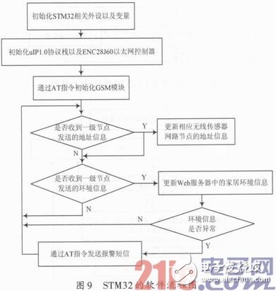 信息处理子系统以意法半导体STM32微控制器为核心,并在STM32中植入uIP1.0协议栈,配合ENC28J60以太网控制器建立Web服务器显示家居环境信息,STM32程序流程图如图9所示。当环境数据超过警戒值时(如温度超过40℃等),STM32微控制器会向GSM模块SIM900A发送AT指令来向用户发送报警短信。最后,信息处理子系统会将家居环境信息定时存储在SD卡中以备用户查询。