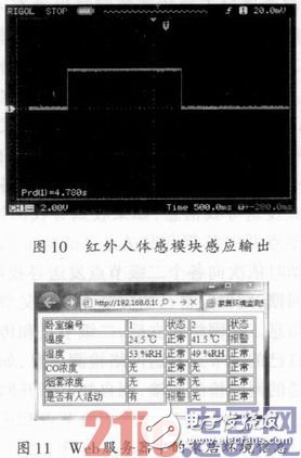 为验证系统的可行性建立基于Basic RF的无线传感器网络家居环境监测预警系统,将信息处理子系统布置在客厅,分别对两间卧室进行温湿度、烟雾、一氧化碳和是否有人活动进行监测预警。在卧室2用电烙铁升高TCN75温度传感器周围的温度,同时有人在卧室1中DYP-ME003红外人体感模块感应范围内活动,可用示波器检测到红外人体感模块有2.5 s的高电平输出,如图10所示,证明在检测范围内有人活动。