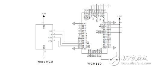 在原有设计的基础上添加一个功能实现模块,从技术风险的角度上,我们还是能接受的。WGM110模块在硬件连接方面,提供了多种通讯接口,如I2C接口、USB接口和Uart接口。在此次设计中,我们使用了Uart接口作为主控芯片与WiFi模块数据交流的桥梁(这里小小的提示一下,双方的Uart接口的TXD与RXD要交叉连接),硬件连接图如下图1所示: