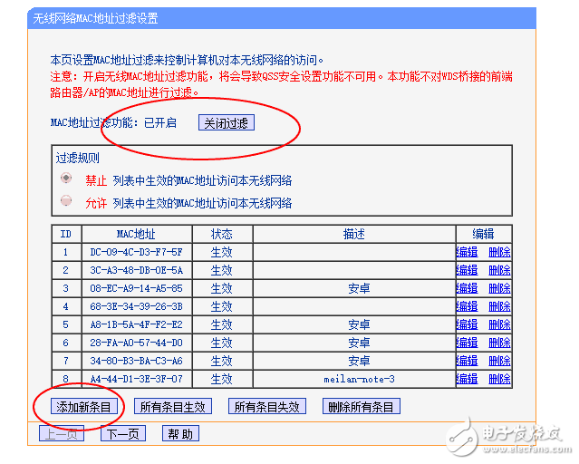 4.开启WIFI的MAC过滤功能,直允许自己允许的设备上网,这样就不存在被盗用问题了,就算破解了密码,照样没网。设置方法“无线设置”——“无线MAC地址过滤”,输入自己的设备IP就可以了,禁用其他的IP地址。