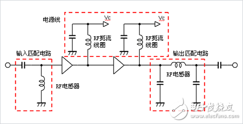 为了达到阻止 (扼流) 交流 (信号或噪声) 、只通过直流的目的,PA的电源线采用扼流线圈。如果扼流线圈出现电压下降,就会影响PA特性,因此希望电感器的直流电阻尽可能小。一级的输出功率较小,因此流过扼流线圈的电流较小; 随着后一级输出功率的增大,流过扼流线圈的电流将增大。