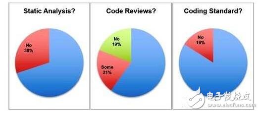 接着让我们继续更深入一点探讨:要符合产业安全性标准,可能耗费大量成本与时间,那么要实现一个优良设计的其他最佳实作呢?例如在软体设计上使用编码标准、程式码审查以及统计分析?在这个技术领域从事攸关安全装置设计的工程师受访者们的回应更令人担心了,请看下图的统计: