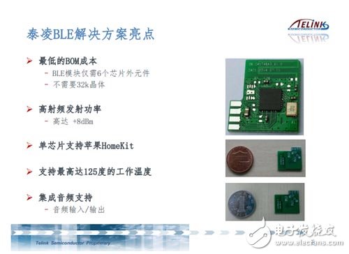 泰凌BLE Mesh解决方案亮点包括:1)最低的BOM成本,芯片外围只需6个元件,不需要32k晶体;2)射频发射功率高达8dBm;3)单芯片支持苹果Homekit;4)支持最高125度工作温度;5)集成音频支持。