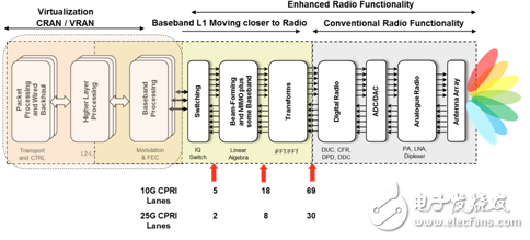 十多年前,分布式基站的概念开始问世,目的是克服使用同轴线缆从位于塔底的传统基站向安装在塔顶的天线发送信号时的功率损耗问题。远程射频单元位于紧邻塔顶天线的位置,以避免功率损耗。这些远端射频单元通过光纤连接至基带 BTS 机架。制定的通用公共无线接口(CPRI) 协议用来传输数据和同步远端射频。在有些无法使用光纤的情况下,使用微波或毫米波无线电来传送 CPRI 有效负载。这种架构转变使运营商有望能够混合使用和匹配来自不同系统厂商的无线电和基带机架,以降低成本,改善供应链,以及简化库存管理。然而互操作性问题让这种希望化为了泡影,不过为一级系统厂商开启了新方法,使其能够利用来自小厂商的无线电设备来控制针对不同地区的无线电设备种类的快速增长。