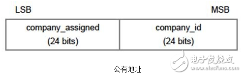 公有地址的构成包含了两个部分,一部分是公司识别码(Company ID),其需要通过IEEE注册机构付费获得,公司识别码长度为24比特,处于48比特设备地址的高24比特;另外一部分是公司分配码(Company Assigned ID),其长度也为24比特,处于48比特设备地址的低24bit,如下图所示。
