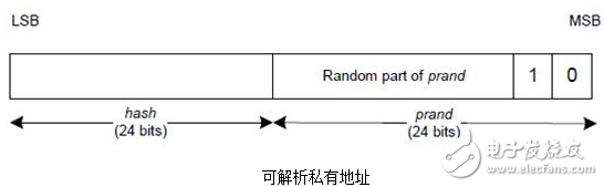 假设有两个蓝牙设备,分别是设备A和设备B,在两个蓝牙设备A、B建立连接之后,这两个蓝牙设备可以通过配对的方式交换各自的身份解析密钥IRK(Identity Resolving Key, IRK),设备A的身份解析密钥IRK-A,设备B的身份解析密钥IRK-B。假设设备B采用了可解析的私有地址机制,那么设备B就需要周期性的产生可解析的私有地址。下图是可解析随机地址的结构,其中可解析随机地址的高两个比特分别为0和1,作为可解析地址的标识符。