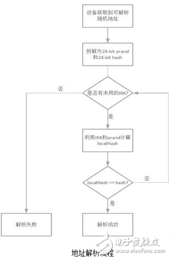 如果生成的本地哈希localHash与拆分得到的哈希hash相等,说明这个地址是设备B所产生的可解析随机地址;如果不等,代表解析失败。设备A可以利用其获取的其他设备的IRK对这个地址就行解析。下图是一个地址解析的流程图。