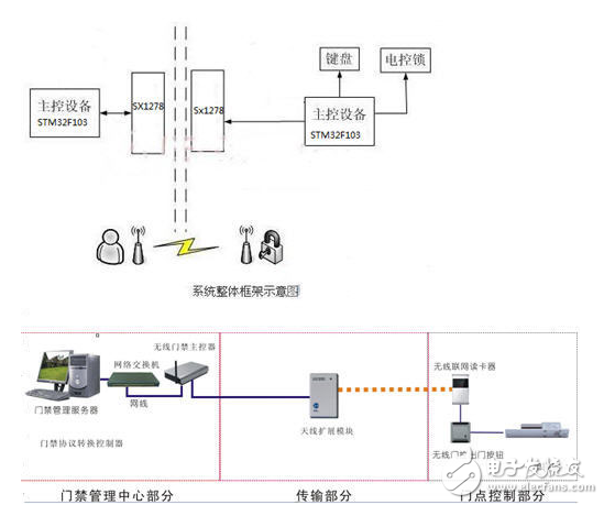 该无线门禁管制系统的硬件主要包括主控设备、电控锁、电源、语音压缩/控制平台,以及无线传输平台等其他接口设备几个部分构成。当被授权用户刷卡开门的时候,读卡器透过发射天线发送一定频率的射频讯号,当射频卡进入发射天线工作区域时产生感应电流,射频卡即可被启动,将自身编码等信息透过卡内建的天线发出,系统接收天线接收到从射频卡发送来的调制讯号,经天线调节器传送到读卡器,读卡器对接收的训号进行解调和译码后送到主控设备进行相关处理。主控系统根据逻辑运算判断该卡的合法性,针对不同的设定做出相应的处理和控制,发出指令讯号控制执行机构动作。若被授权用户忘记带卡,还可以透过系统的外接键盘输入密码来开门。