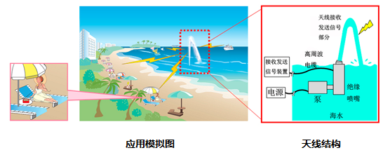 众所周知,天线的开发经过了长期实践、经验的积累,作为硬件的天线发展已步入了成熟期。一般情况下,波长决定了天线的尺寸,低周波数的天线就有几米到几十米的高度。只有规模庞大的载体才能支撑起如此巨大的天线。这样一来,天线的搭建无疑就受到了来自土地、人工、时间等各方面的限制。三菱电机着眼于可以自由变换形状、导电性的液体作为天线的新素材,利用丰富的海水资源,开发了这款新技术——海水天线。海水天线成功弥补了传统天线搭建的不足,无论是海岸还是海上,只要有海水的地方,就可以便捷地搭建出大型喷水装置,来构建可移动的大型天线。而且设备小型化,用船就可以随意移动。