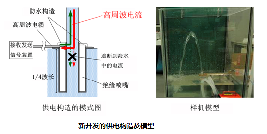 三菱电机开发出了独特的输电装置,该装置带有四分之一波长的筒状绝缘喷嘴,从而可以隔断从连接水柱的高周波电源部分到海里的电流,大大提高了天线的效率。再者,由于海水的导电性比金属弱,要制成同等效率的天线,需要更粗的水柱。为此,三菱电机的科研人员,反复进行尝试、模拟试验,最终开发出的这款海水天线不仅可以成功接收地上数字信号,而且天线的效率※高达70%,达到实际运用标准。