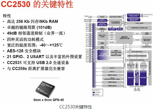 据陈雄基介绍,CC2530是继CC2340、CC2341之后的又一款2.4GHz(2.4~2.483GHz)ISM Zigbee产品。之所以选择继续推出拥挤的2.4G频段产品原因有三:首先它是一个全球性的频段,开发的产品具有全球通用性;其次,它整体的频宽胜于其他ISM 频段,这就提高了整体数据传输速率,允许系统共存; 第三就是尺寸,2.4GHz无线电和天线的体积能够做到最小,产品的体积也能更小。而且由于IEEE 802.15.4 标准中很多机制的保护,使得Zigbee在2.4GHz频段与Wi-Fi、蓝牙、WirelessUSB以及家用的无绳电话和微波炉相比具有更强的抗干扰优势。