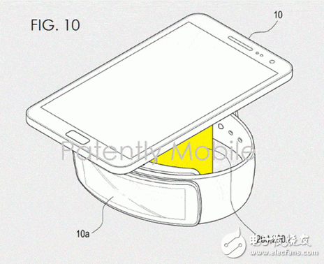 三星这项新专利与以往的平板形状充电平台不同,从上方的专利参考示意图来看,该无线充电设备的形状与圆柱式手机底座相似,除了为手机充电之外,该圆柱还可以套一上类似三星Gear Fit形状的手环。