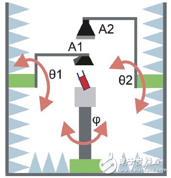 分解法曾经被称为两通道法,意即在测试过程中,有两个发射天线将基站模拟器的信号发送给DUT,DUT 在水平面旋转,而两个探头在垂直面上同时动作,他们首先遇到的一个问题在于DUT 测试位置(角度)与发射天线位置的选择。
