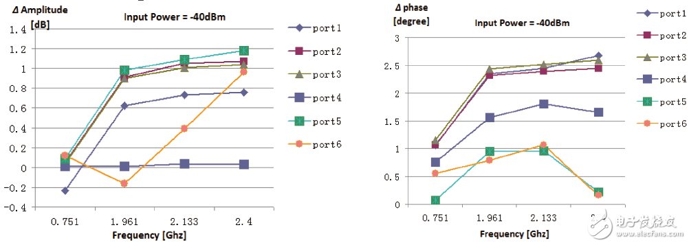 功率放大器的长期信号漂移是描述对应于实验室在两个工作时段,这决定了实验室是否能够在几周甚至几个月时长内,沿用同一个校准数据。我们的摸底测试是在两个工作日,对功率放大器分别重新启动、预热30 分钟之后,输入设置统一分别设置为-40dBm(线性区间之内),测试功率放大器的六个通道,在不同的频率点的输出信号幅度与相位的差异值,测试结果见图 13,测试结果表明两次测试功率放大器最大的信号幅度漂移可能超过1dB,相位漂移则相对较小,这意味着系统在不同的工作时间,测量不确定可能会由于功率放大器的信号漂移而大幅增大,因此我们建议系统应该进行日常校准工作,即校准文件需要经常进行更新。