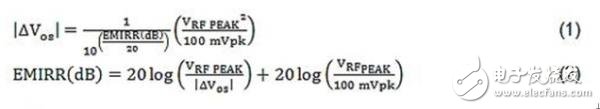方程式(1)和(2)给出了EMIRR的数学定义。两个方程式互为彼此的重置版本。方程式(1)展示了所用RF信号和偏移电压的改变之间的关系。请注意所用 RF信号的平方引起的偏移电压变化。这意味着入射RF信号较小幅度的增加可导致偏移电压的显著增加。还请注意,术语EMIRR的作用是减弱RF信号的影响;换句话说,较大的EMIRR(dB)可使偏移电压的变化大幅度减少。方程式(2)是在表征过程中用来计算EMIRR(dB)的方程形式。