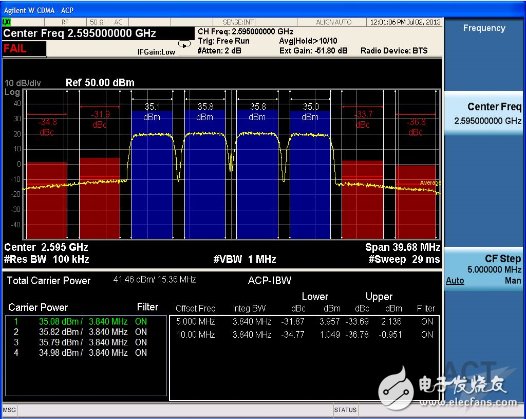 用带宽为19.84MHz的WCDMA 四载波信号测试ACP