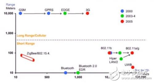 各种不同通讯方式的传输距离和传输码率的对比,一般超过500米的算是远距离通讯传输,常见的如GSM、GPRS和3G等,短距离传输如ZigBee、Bluetooth、UWB等。