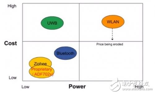 下图所示的不同的通讯技术的功耗和成本的对比,在之前的博客中,我们了解过各种不同的传输方式详细介绍,我们在这里再不厌其烦的进行下简单的对比。这里我想说的是,Zigbee虽然传输的码率不大,但是功耗极低、系统简单、成本低,在实际中达到广泛的应用。而作为1999年就已经出现的蓝牙技术,目前应用的典型代表还是仅限于高端手机的无线耳机。