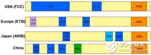 下图是各个国家多支持的ISM/SRD频段,其中除了2.4GHz以外,其他各频段都基本各不相同。ISM指的是工业、科学和医疗所分配的频段,所以对于常用的射频芯片来说,支持多频段是实现其应用的最重要的一个功能。