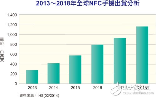近距离无线通讯(NFC)手机普及率正急遽攀升。市场研究机构IHS指出,2012年全球NFC手机出货量为一亿二千万支,至2013年已攀升至二亿七千五百万支,成长高达128%;预估2014年将再增长至四亿一千六百万支,并在2018年跃升到十二亿支的规模。