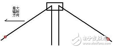 倒“V”天线,这是DP天线的一种变形方式,这样做的一则可以节省天线的占地面积,另一方面,可以改善原先DP天线的近距离地波通讯效果。但这样做之后,天线具有了方向性,参见图中的最大辐射方向。