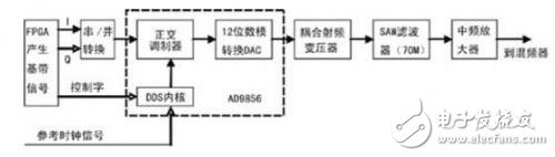 从图2可以看到,在FPGA内进行编码调制,产生的I/Q两路信号经由串并转换后送入AD9856 中,在AD9856内部有一个DDS内核,通过FPGA控制产生正交本振信号送入正交调制器,每路通过2级分别与I/Q信号相乘之后相加,产生正交调制信 号,而具体的调制模式可以通过FPGA的基带信号编码映射设计,最后通过12位DAC变为正交调制的模拟差分信号输出,接着用耦合射频变压器将输出的差分 信号转换为单端信号,经由70MHz的SAW滤波器滤波,最后选用中频放大器进行信号放大,就可送入混频器进行混频了。