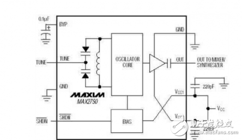 ADF4113是ADI公司的一款高性能频率合成器,最高工作频率达到4GHz。ADF4113主要由一个低噪声数字鉴相器(PFD)、一个精 密电荷泵、一个可编程参考分频器、可编程A(6bit)及B(13bit)分频计数器和一个双模分频器(P/P+1)构成。MAX2750是MAXIM公 司用于2.4GHz到2.5GHz的ISM频段的压控振荡器,工作在2.4GHz~2.5GHz的ISM频段,其电路结构如图5所示。