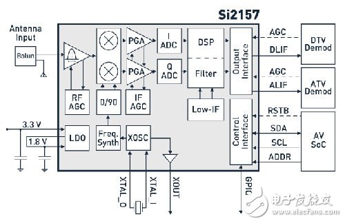 高集成度的Si21x7调谐器旨在为批量市场带来最低BOM成本的硅电视调谐器解决方案。与竞争对手硅TV调谐器相比,Si21x7调谐器不需要在RF输入端添加片外平衡-不平衡转换器(balun),这大大降低了系统的成本和复杂性,且没有性能损耗。此外,Si21x7电视调谐器集成了所有跟踪滤波电感器,并且他们无需电感电源滤波,这归因于片内高电源纹波容限,这对于电路板级设计是一个关键考虑因素。集成的电源复位监控器和可选的3.3V单电源供电进一步降低了系统成本。另外,Si21x7调谐器在引脚提供了增强的静电放电保护和性能,这对于电视模组设计来说非常关键,不再需要昂贵的ESD二极管,使得需要较高ESD抗扰度的顶级电视模组生产商减少了BOM成本。