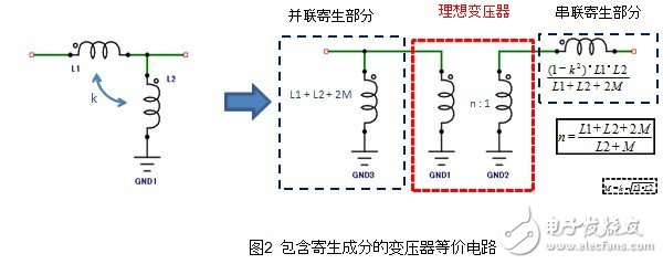 如果在这样的天线中安装一定变压比的变压器,是不能只整合一个band的阻抗的。所以,天线用变压器,必备的设计需求是要使变压比适应天线的阻抗频率特性。这种适应方法如图2所示,是一种将理想的变压部分和寄生成分部分分解开来的等效电路。
