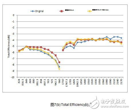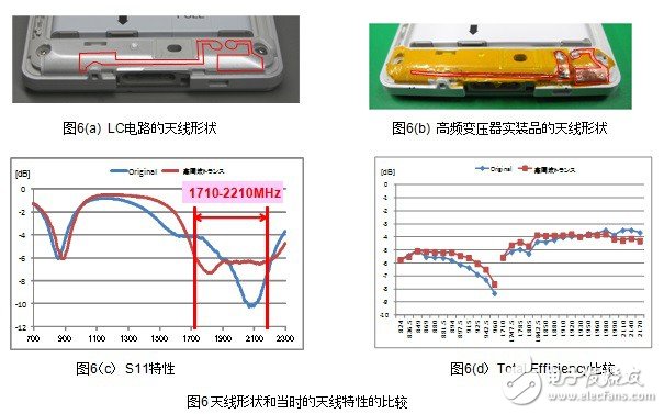 结果显示,low band 情况下LC电路和高频变压器都不可能达到「S11<-6dB」(反射损耗1.2dB)。而high band情况下,达到「S11<-6dB」范围的,如果使用LC电路的话是300MHz,而使用高频变压器的话则是500MHz,达到了66%的改善效果。(图6(c)) 。此外,LC电路和高频变压器中天线的综合特性显示「Total Efficiency」,low band的高频侧也得到了0.6dB的改善效果。(图6(d))。这种改善效果正是由于带宽的广带宽化和I.L.得到了改善。