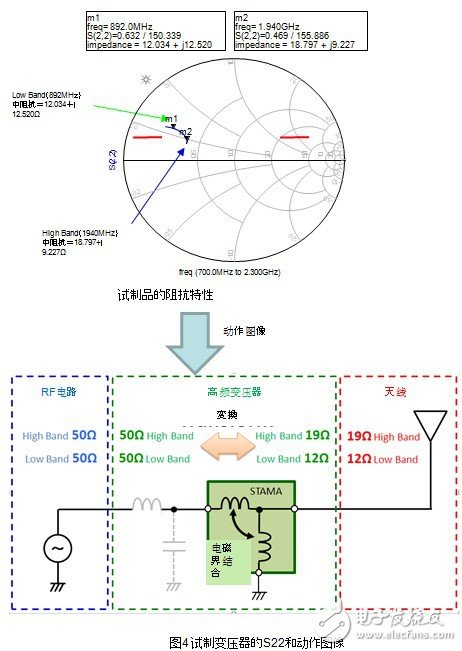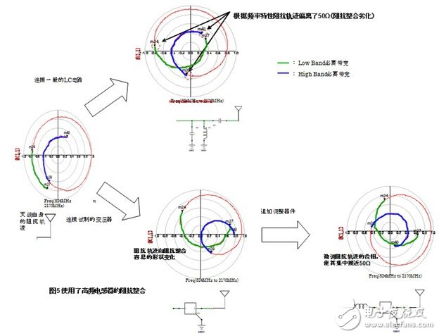 将普通的LC电路跟天线连接,根据频率特性的不同在广带宽情况下阻抗整合会变得困难。针对该情况,将本次试制的高频变压器跟天线连接,low band和high band都转换成了最合适的阻抗。也就是说,工匠图上的阻抗轨迹有可能变化成阻抗整合容易的形状。之后通过外部的调节元件将阻抗轨迹的相位进行微调,有可能非常容易的就集中在50Ω附近了。(图5)