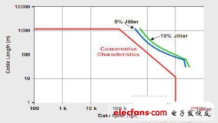 线缆长度与数据速率的对比特性表明,应使用1200m(4000英尺)的最大线缆长度(图1)。使用该长度时,常用120-Ω、AWG24无屏蔽双绞线(UTP)的电阻接近端电阻器值,并使总线信号摆幅减小一半(6 dB)。