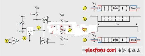 两种最为常用的时序控制方法是图3所示单触发电路和图4所示时延反相缓冲器电路。为了确保正确的开关行为,两种方法都要求对上电和总线闲置以后的启动条件进行定义。通过故障保护偏压电阻器RFS可以完成这项工作,其在没有收发器有效驱动总线时,产生一个大于接收机输入敏感度VFS》 +200 mV的故障保护电压VFS。
