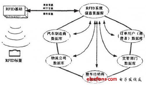 图中,以RFID系统采集到的被标识物的信息首先被存储到统一的信息资源库中,然后,各个对象的服务通过信息资源库的信息挖掘等手段获得服务。其显著特点是以采集到的信息为基础,依靠挖掘等数据开发技术,面对多元服务。在整车物流管理的各个业务环节,分布在不同空间的RFID信息采集系统将整车信息采集到一个统一的数据库中,整车的信息经过处理后,可以得到较为统一的运输信息(订单用户和经销商所关注的)、仓储信息(物流公司所关注的)等。