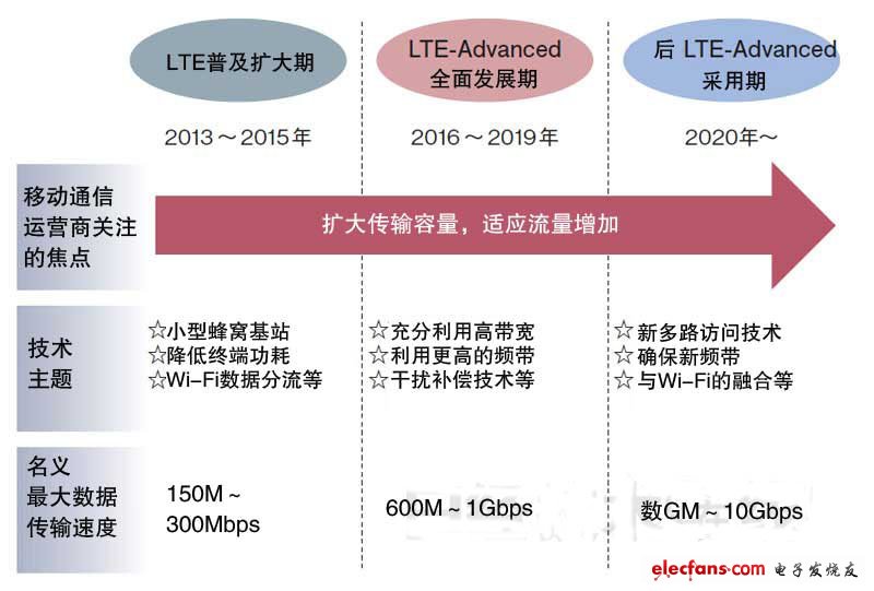 接下来的2016~2019年是LTE-Advanced的全面普及期。到2016年左右,1个通道可以利用的带宽估计为80M~100MHz。此时,最大数据传输速度将达到1Gbps。