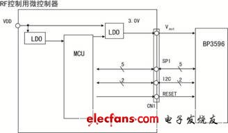 RF控制用微控制器与RFIC连接时,SPI(5pin)、EEPROM通过I2C(2pin)、GPIO连接。与RF控制用微控制器之间的接线图如图3所示。可见,用很少的布线数即可轻松连接。